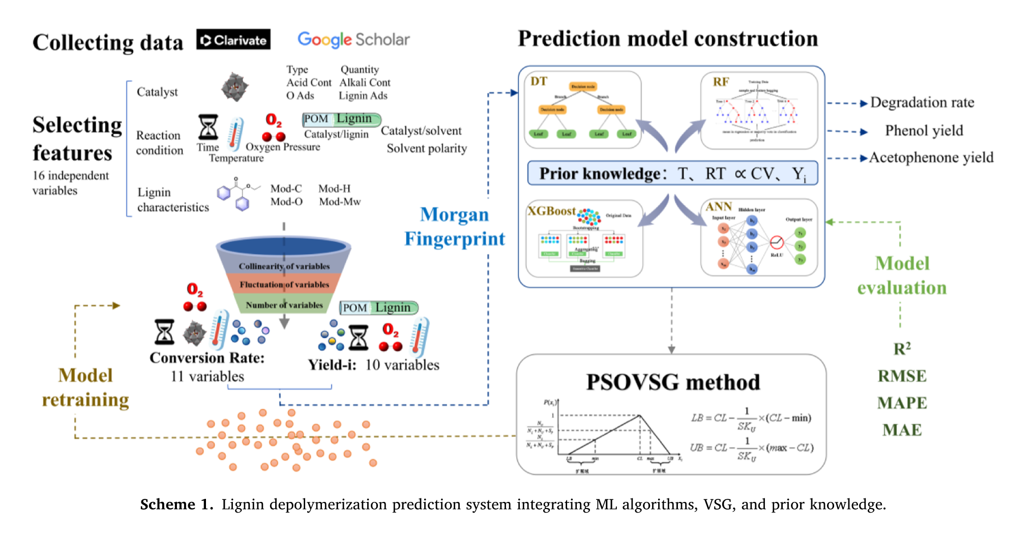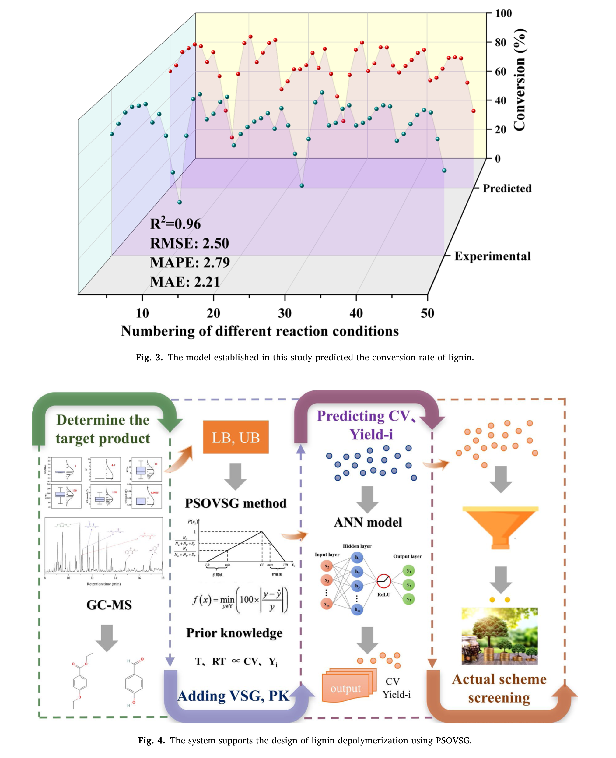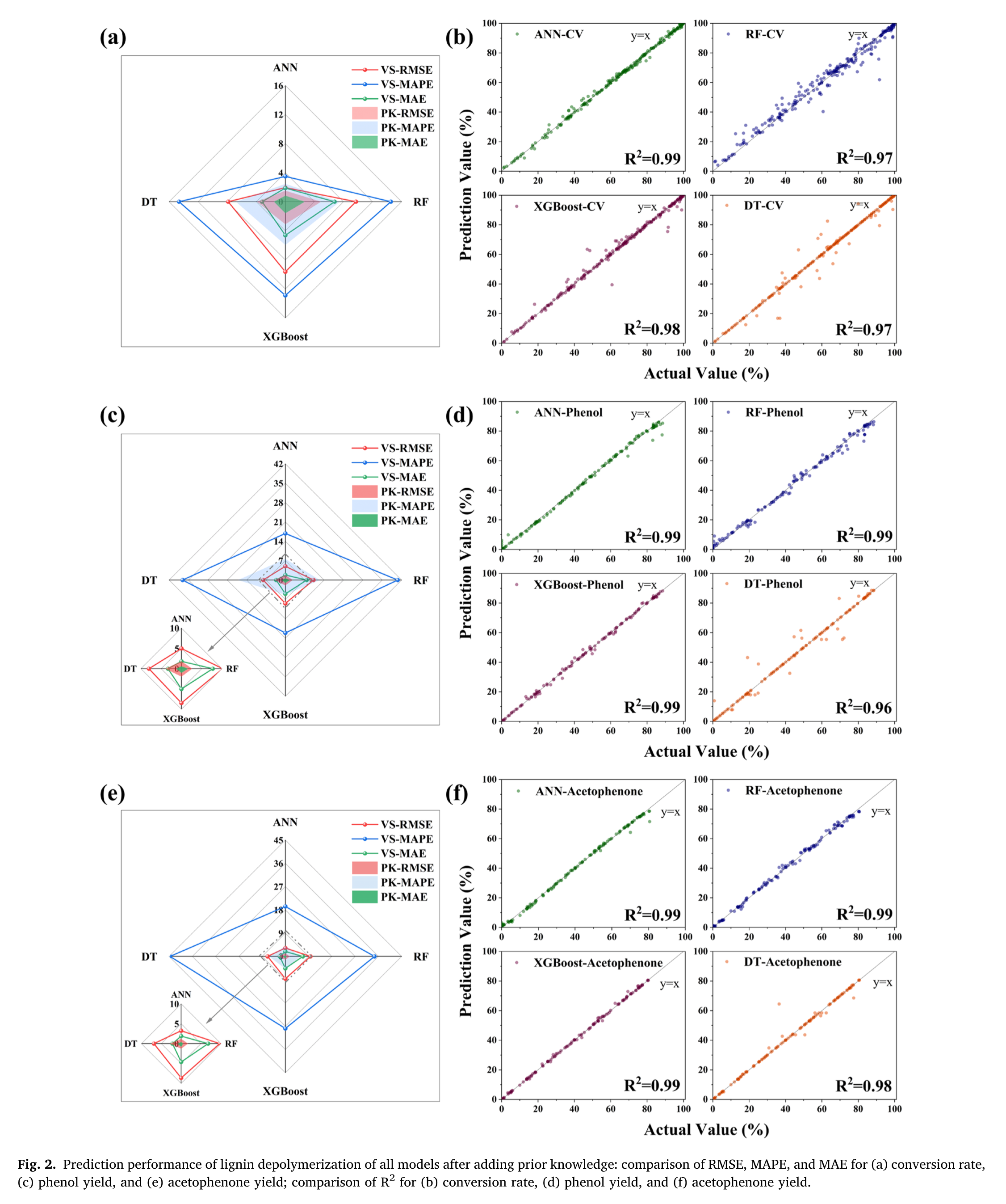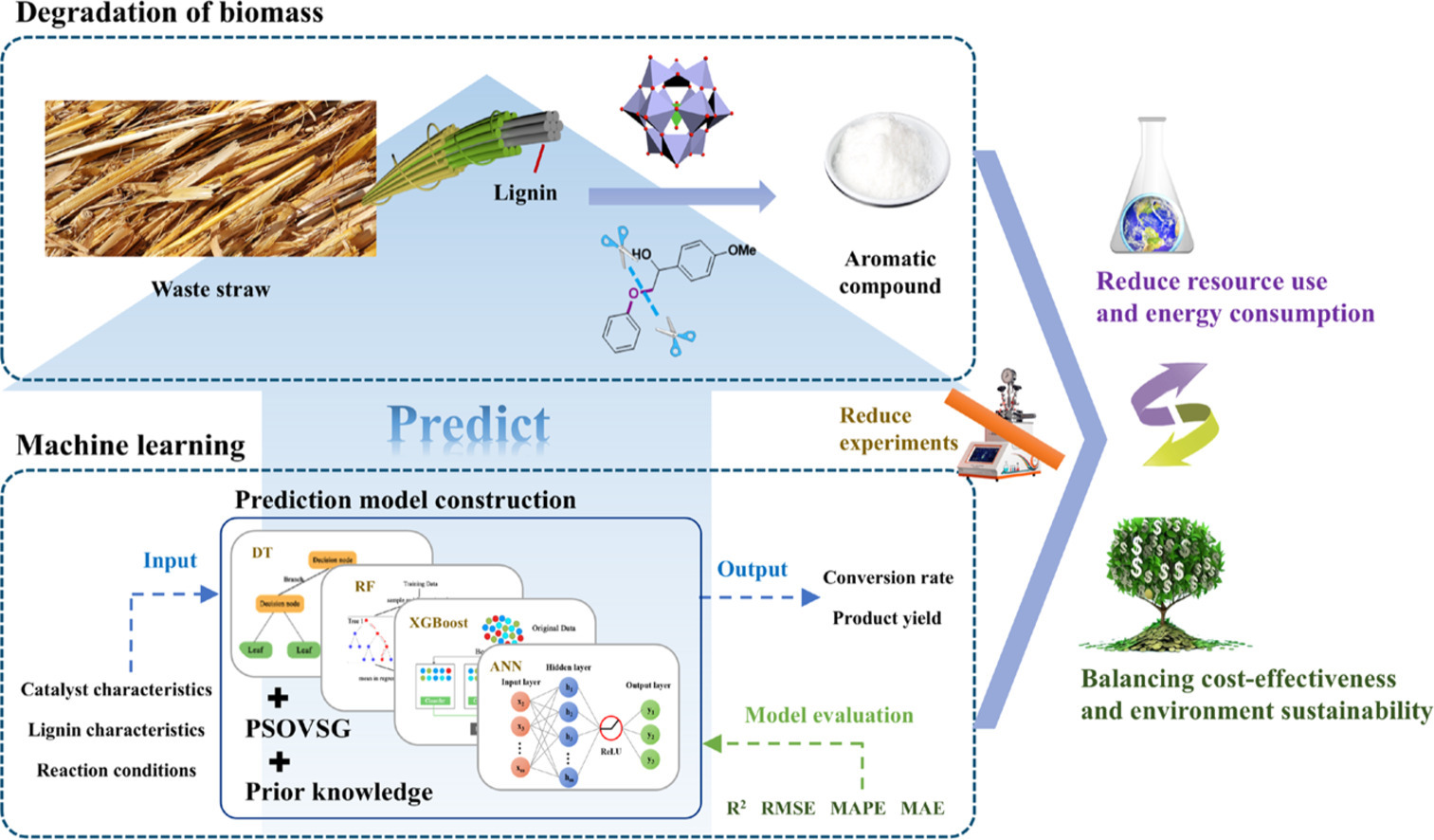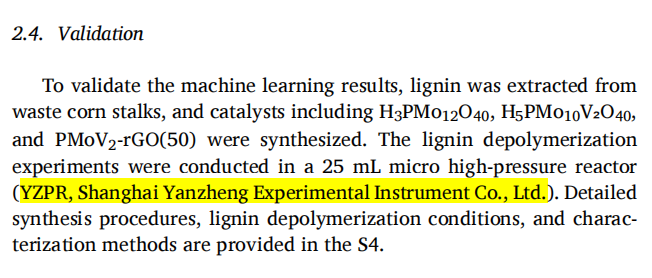 生物质作为一种可再生碳资源,在应对日益严峻的能源危机方面具有巨大潜力。其中,木质素作为生物质的关键组分,可通过多金属氧酸盐催化转化为高价值化合物,相关的木质素解聚实验在 25 mL 微型高压反应釜(YZPR-25,上海岩征实验仪器有限公司)中进行。然而,传统方法在催化剂选择和反应优化过程中依赖反复试验,不仅导致化学试剂的高消耗,还造成资源、能源与时间的显著浪费。为解决这一问题,本研究整合机器学习技术,开发了木质素解聚的预测建模与逆向设计系统,用于优化催化剂选择及反应条件。在所评估的模型中,人工神经网络(ANN)表现最优,对木质素转化率及苯酚 / 苯乙酮产率的预测 R² 值分别达到 0.91、0.90 和 0.90;引入虚拟样本生成(VSG)及先验知识后,模型预测精度显著提升,平均 R² 值从 0.66 提高至 0.98。本研究为木质素解聚提供了一种更高效、更经济的方法,有助于提高资源利用率,为可持续发展做出贡献。