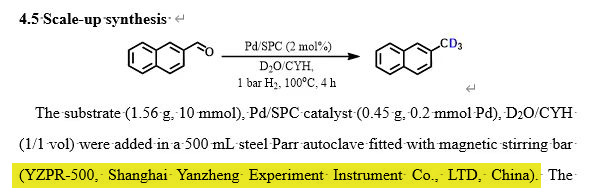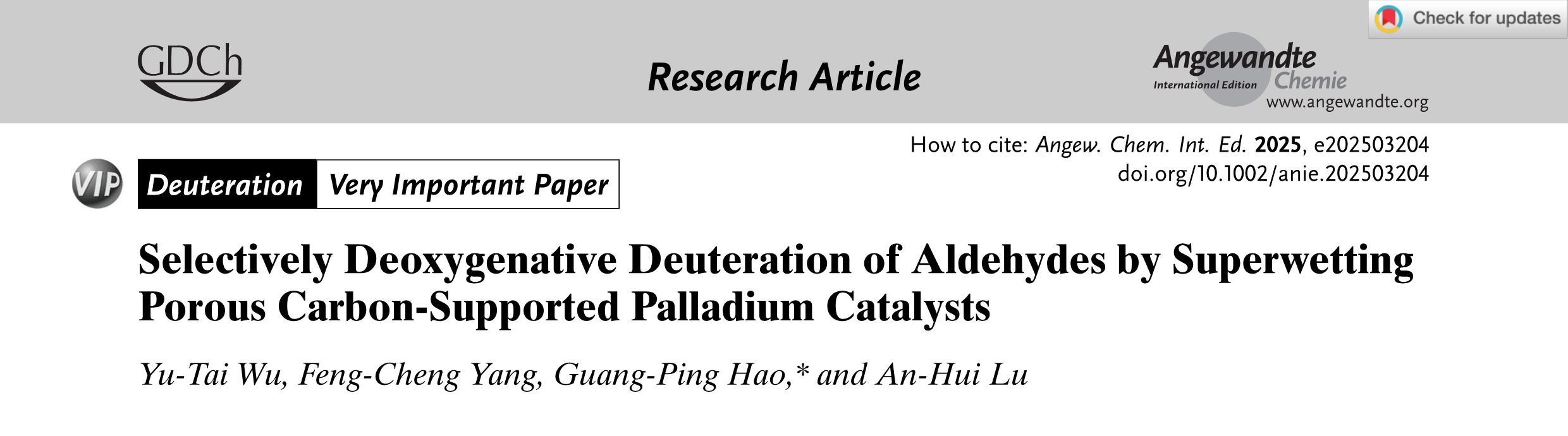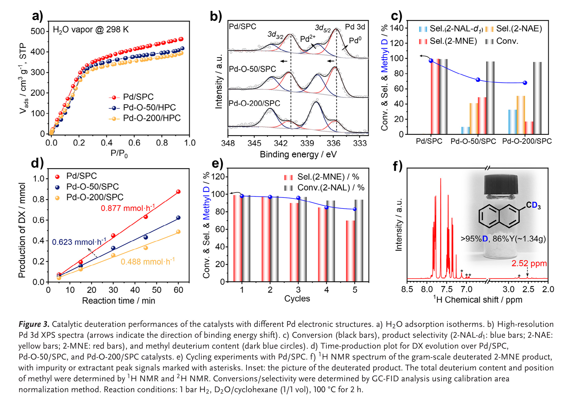 该工作报道了一种超浸润炭负载的Pd基催化剂(Pd/SPC),通过催化DDA反应,实现以芳香醛在D2O/H2体系中定点氘代,合成了CD3芳烃化合物(氘含量>95%)。该工作为醛基平台化合物的精确氘标记方法提供了一种非均相催化剂的设计新策略,在醛分子氘标记方面具有应用潜力。